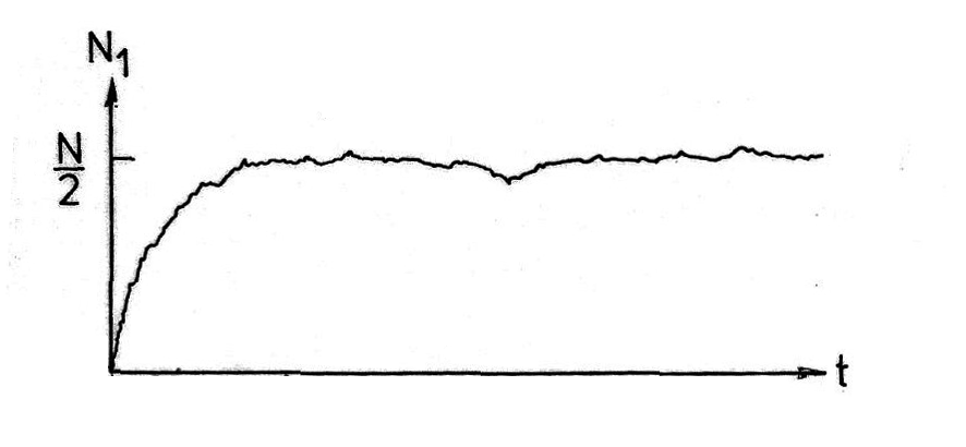 Für die heutige Physik sind die Grundgesetze invariant gegen Zeitumkehr. So kommt es zu der Frage: wie folgt ein nicht zeitumkehrinvariantes Gesetz, wie das Ohmsche, aus zeitumkehrinvarianten Grundgesetzen? Nun, der Physiker versteht das als Übergang in einen wahrscheinlicheren Zustand. Ersetzen wir (ohne wesentliches zu ändern) die Elektrizitätsleitung bei konstanter Spannung, die ein Fließgleichgewicht ist, durch den Spannungsausgleich zwischen zwei begrenzten Leitern, die durch einen dünnen Draht verbunden seien, also durch einen Vorgang, der einem Gleichgewicht zustrebt. Wir haben dann ziemlich das Gleiche wie den Druckausgleich des Gases in zwei Kammern, die durch eine enge Öffnung verbunden sind. Nehmen wir zwei gleiche Kammern an und beginnen wir mit einer leeren Kammer, also den Molekelzahlen $N_1 = 0$. $N_2 = N$, so wird $N_1(t)$ bei kleiner Zahl $N$ etwa durch die Abb. 1 wiedergegeben. $N_1$ bleibt in der Nähe von $N/2$. Vom ersten Anfang abgesehen, ist der Verlauf (statistisch genommen) symmetrisch in den beiden Zeitrichtungen. Wenn eine merkliche Schwankung auftritt, so erwarten wir, daß sie sich nach der Zukunft hin abnimmt und in der Vergangenheit entsprechend zugenommen hat.