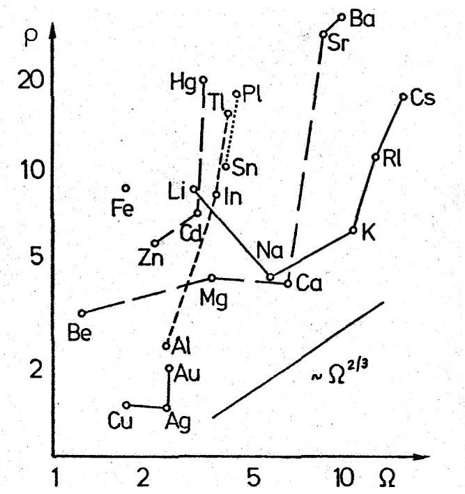 In Abb. 3 sind für eine Anzahl chemischer Elemente diese Größen in logarithmischem Maßstab und willkürlichen Einheiten angegeben. Die Beziehung $\sigma\propto\Omega^{2/3}$ erscheint jetzt als Grenze, rechts und unterhalb derer nichts vorkommt; was weiter links oberhalb liegt, zeigt eine "Unfreiheit" der Elektronen an.