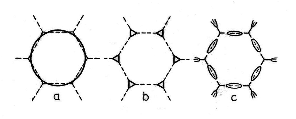 Die etwa 1927 vollendete Quantentheorie brachte zwei entscheidende Neuigkeiten. Die Unteilbarkeit des Wirkungsquantums $h$ ergab die quantentheoretische Unbestimmtheit, den Dualismus Welle-Teilchen, das Übergreifen der Wellenfunktion in benachbarte Potentialmulden, den "Tunneleffekt". Die Unteilbarkeit des Elektrons bedeutete die Ununterscheidbarkeit von Elektronen und die Fermi-Statistik. Für die Stoffeigenschaften sind beide Züge wichtig. Die aus dem erstgenannten Zug folgenden diskreten Energiezustände eines Atoms sind wegen des zweiten Zuges bis zu einer Stelle besetzt. Bei einer Molekel aus zwei gleichen Atomen sind wegen des zweiten Zuges die Energien paarweise geordnet. Bei einer Anhäufung von $N$ gleichen Atomen entstehen Gruppen von je $N$ Energiewerten; bei einer unendlichen periodischen Folge gleicher Atome entstehen "Energiebänder" einfacher Struktur, die bis zu einer Energie $\zeta$ besetzt sind (Abb. 2).